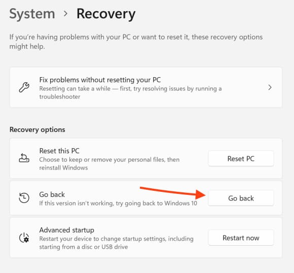 3. Click the «Go back» button: in the «Recovery Options» section, select the option to return to the previous version.