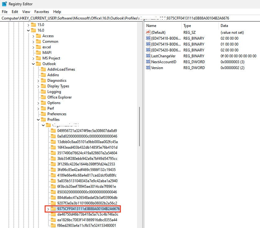 4. Under the profile, locate and expand the registry subkey 9375CFF0413111d3B88A00104B2A6676.