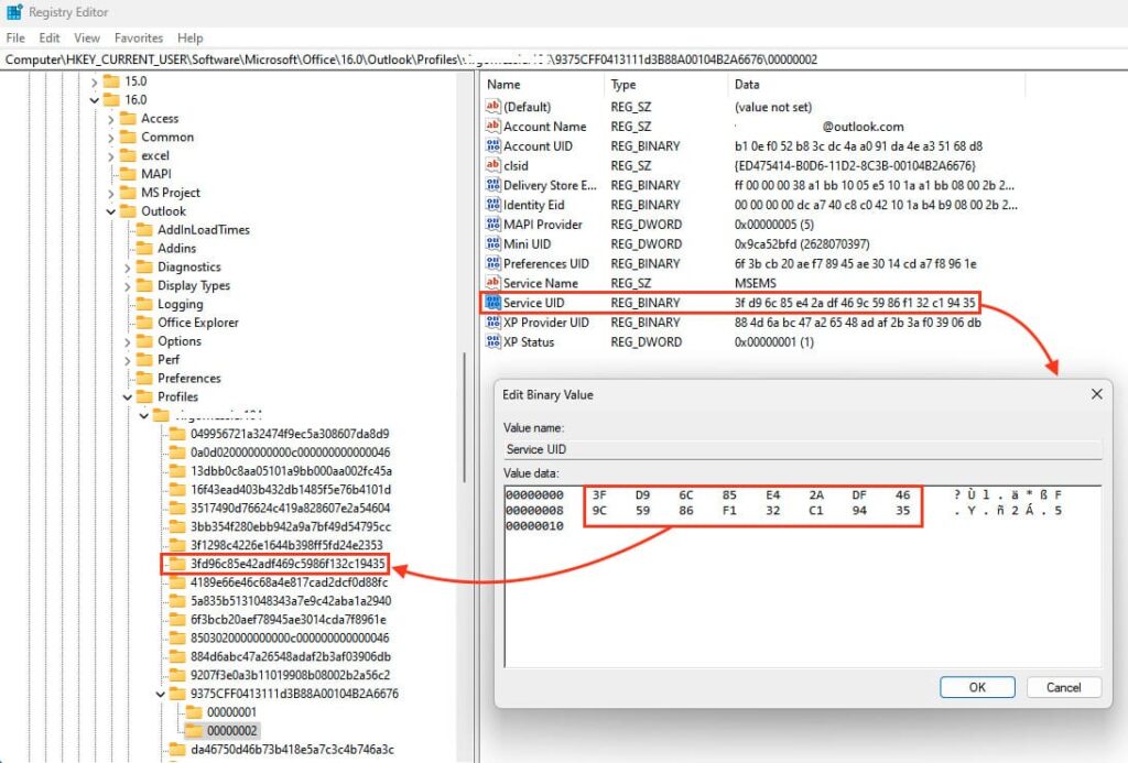 5. Under the 9375CFF0413111d3B88A00104B2A6676 subkey, you will see a registry subkey for each account in your profile. Select the first subfolder (00000001), then check the binary data of the «Account Name» value by double-clicking the value. Repeat this process until you find the account name value that includes your SMTP address. For example, the account name value might indicate guidopica@contoso.com under the subkey \00000003.