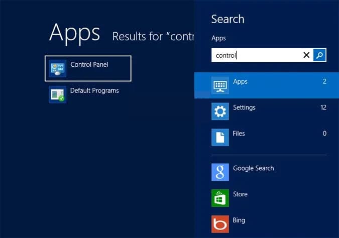 — In Windows 8, swipe in from the right to open the charms, tap or click Search, then type «Control Panel» in the search box. Or type «Control Panel» on the Start screen and select Control Panel in the search results.