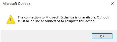 — «The connection to Microsoft Exchange is unavailable. Outlook must be online or connected to complete this action.»