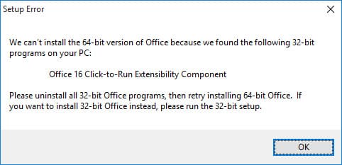 If you encounter the following error during the installation of Microsoft Office installer: «We can’t install the 64-bit version of Office because we found the following 32-bit programs on your PC: Office 16 Click-to-run Extensibility Component … « — it may indicate that you have another version of Microsoft Office installed concurrently, or remnants of it remain in the system if you have already uninstalled it.