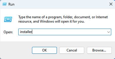 Open the «Run» window. You can do this by pressing the Win + R hotkeys and entering installer in the input field.