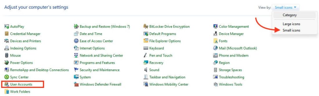 2. Switch the view mode from Category to Large icons or Small icons. This can be done using the switch in the top right corner of the Control Panel window.