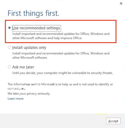 When Excel opens, you will see a window prompting you to apply update settings. You can choose «Recommended» so the application will download and install updates automatically. Apply the settings.