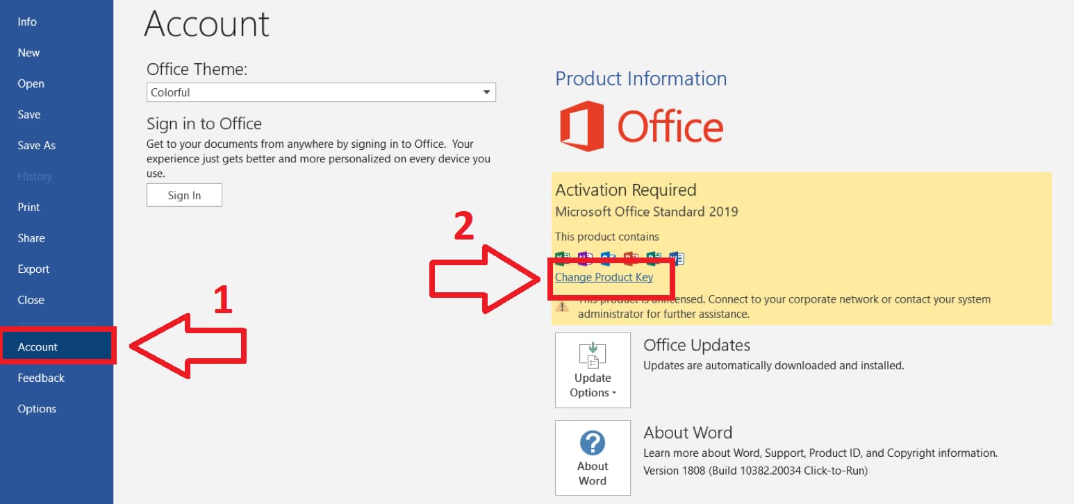 6) After opening the «Account» menu, and in this window click «Change Product Key».