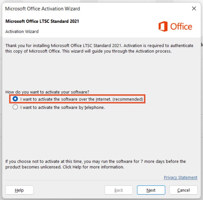 10) Select «I want to activate the software over the Internet. (recommended)» and click «Next»