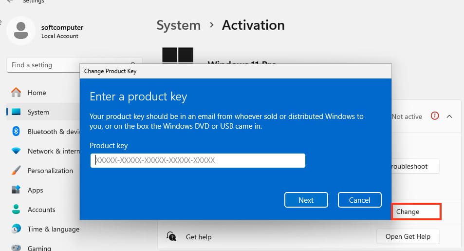 10) Activate your Windows for full functionality by going to Settings > System > Activation, then click «Change» and enter the product key, which you can purchase in our store.