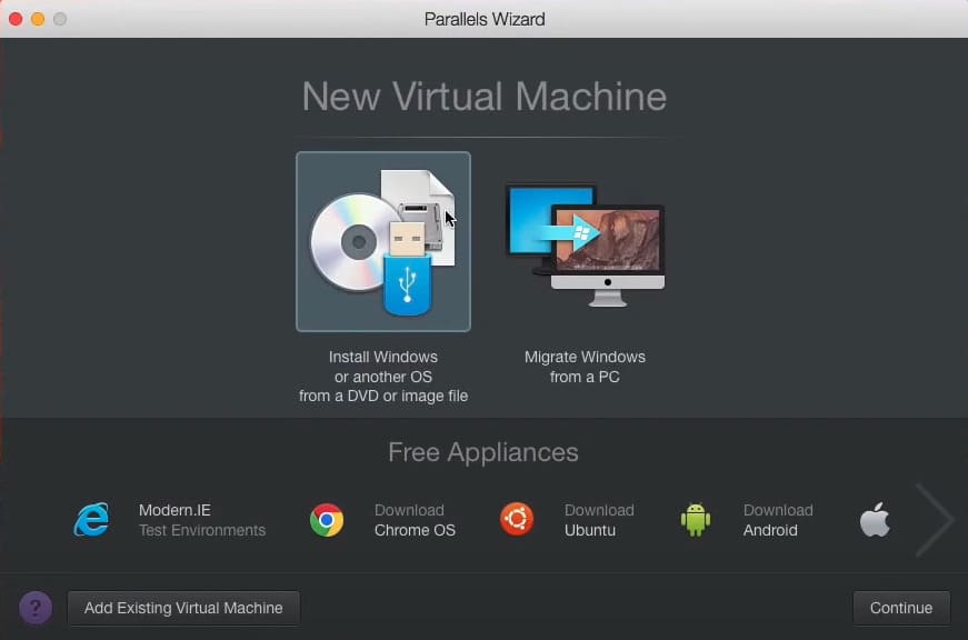 3. After installing the Parallels Desktop application, launch it and select «Install Windows or another OS from DVD or image file». In our case, it will be an image. After selecting, click «Continue».