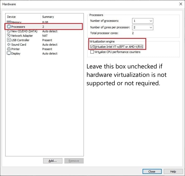 The next item is the number of cores to allocate for VM operation. Also, activate hardware virtualization if you have enabled it in the BIOS. If not, leave this option unchecked.