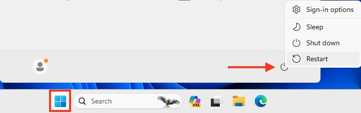7) Go to «Start», click on the shutdown icon, and select «Restart».