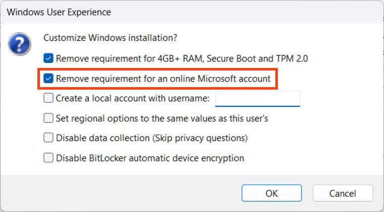 If you are creating the installation USB drive using the Rufus utility, check the «Remove requirement for Microsoft account» option. This will allow you to install Windows 11 with a local account, bypassing the Microsoft account requirement.