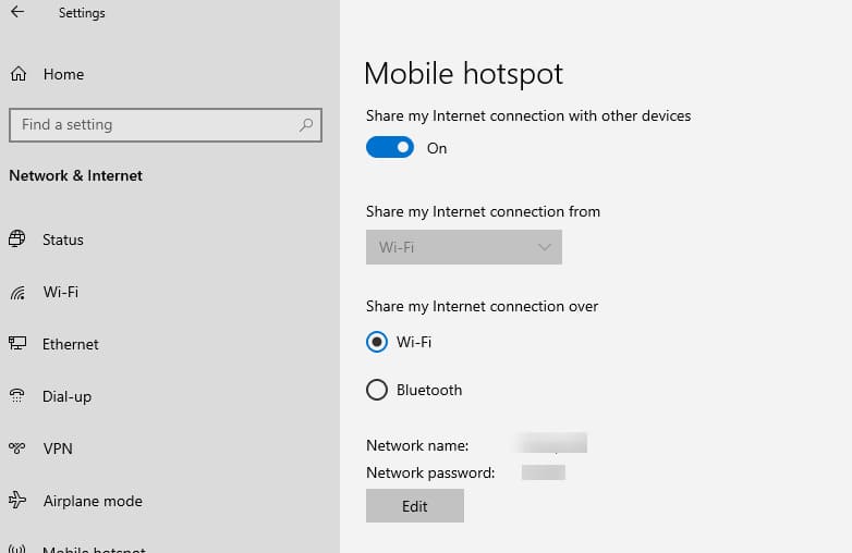 All you need to do is enable this feature, select the connection that other devices will access, and set the network name and password. After that, you can connect to the created network. If you have the latest version of Windows 10 and your connection type is supported, no additional setup methods are required (for example, sharing PPPoE may not work).