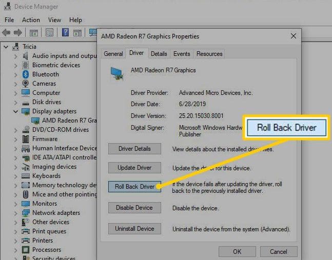In some cases, reverting the driver to a previous version may help. To do this, go to the Windows 10 Device Manager (accessible via right-clicking the «Start» button), find the required device under Network adapters, right-click it — Properties > Driver tab — Roll Back Driver.