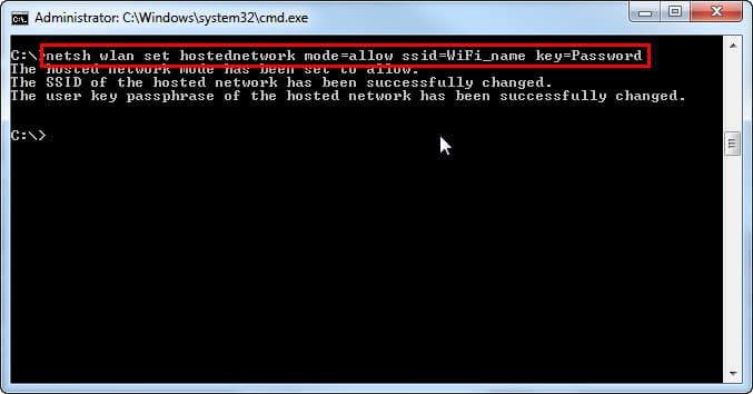 netsh wlan set hostednetwork mode=allow ssid=softcomputers key=secretpassword