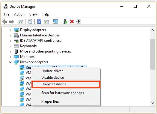 — In the Device Manager, disable the Wi-Fi adapter, then enable it again (or remove the adapter and update the hardware configuration).