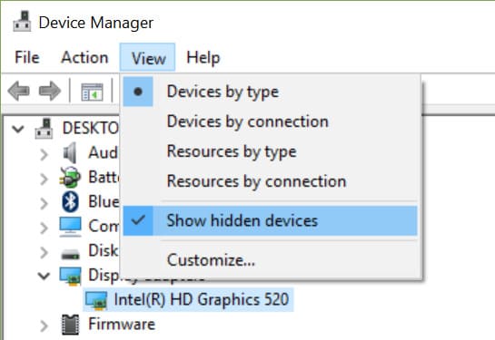 — In the Device Manager, open the View menu and enable Show hidden devices.