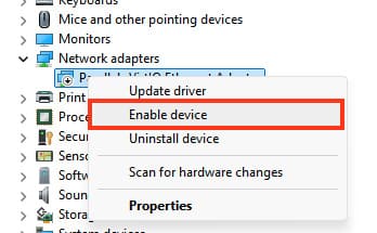 — In the Network adapters section, find Microsoft Hosted Network Virtual Adapter, right-click it, and select Enable.