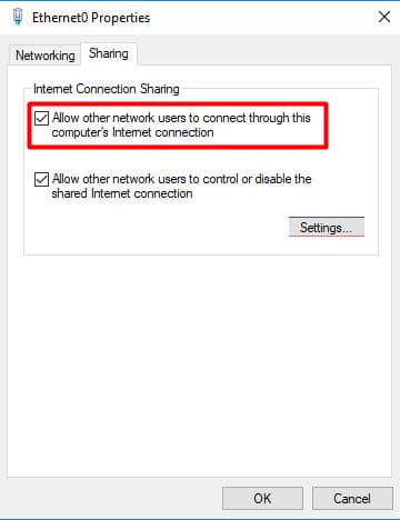 — Go to the «Sharing» tab and enable the option «Allow other network users to connect through this computer’s Internet connection.»