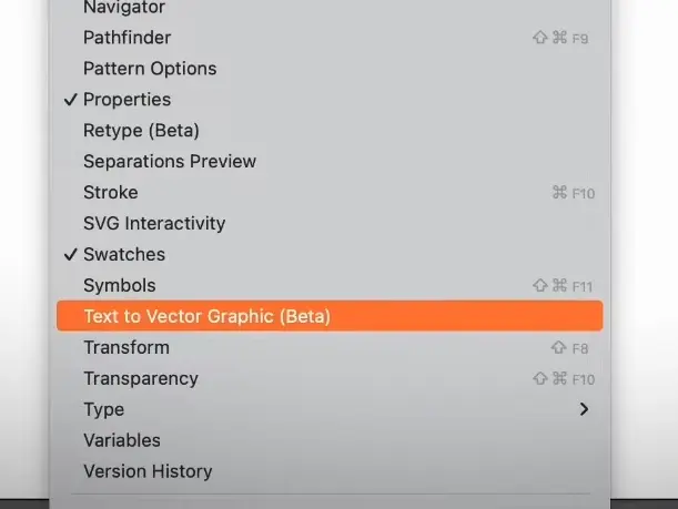 Функция Text to Vector Graphic доступна на контекстной панели задач (Contextual Task Bar) внизу рабочего пространства или через отдельную панель (Окно > Text to Vector Graphic).