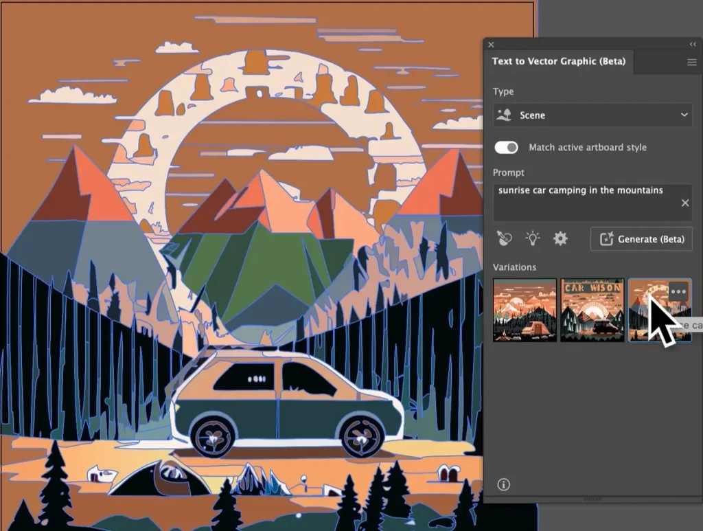 4. Генерация: Нажмите «Generate». Illustrator связывается с облачным сервисом Firefly и через несколько секунд предоставляет 3 варианта векторного объекта в панели.