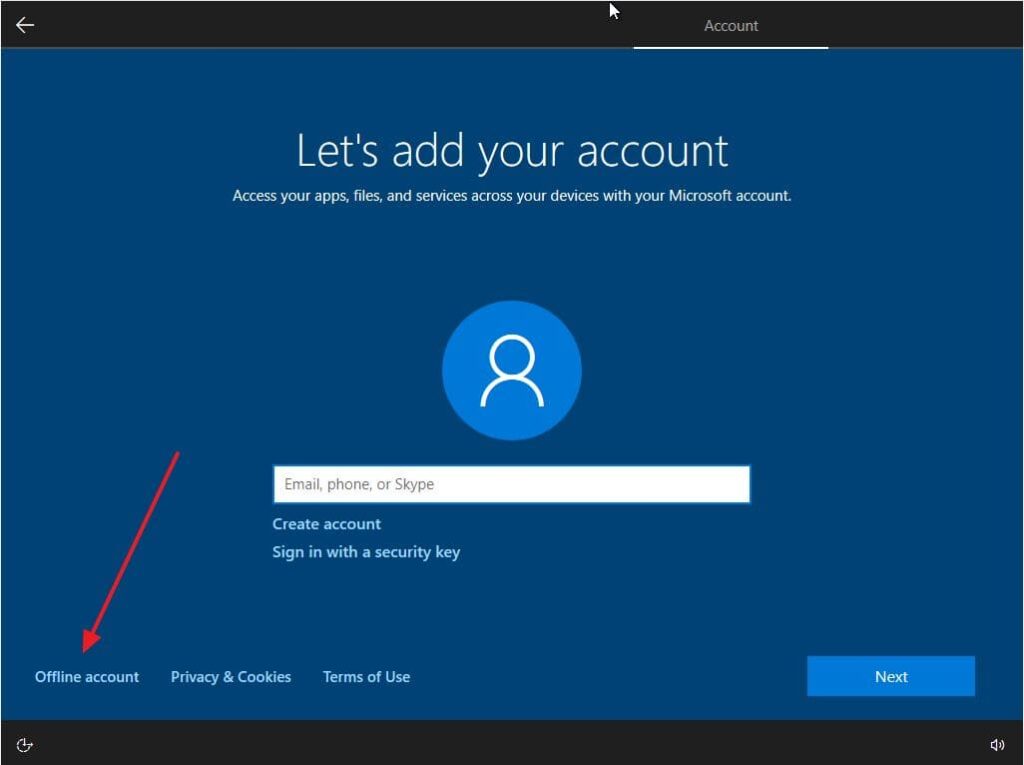 In the next window, you can log in with your Microsoft account if you have one. If not, you can create one later and click «Offline Account», which I will do in this example.