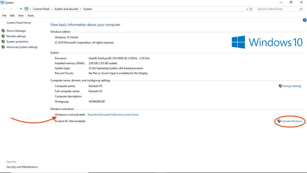 But there is one more important detail. You need to activate your Windows 10 because the trial period is only 30 days. If you go to the «System Properties» menu, your system will be shown as not activated.