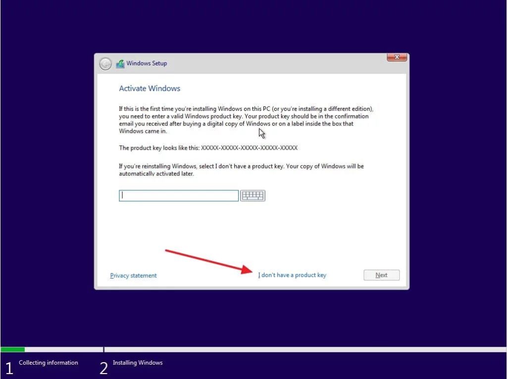 You can skip entering the product key during installation. We recommend activating the system after installing Windows 10. So click «I don’t have a product key».