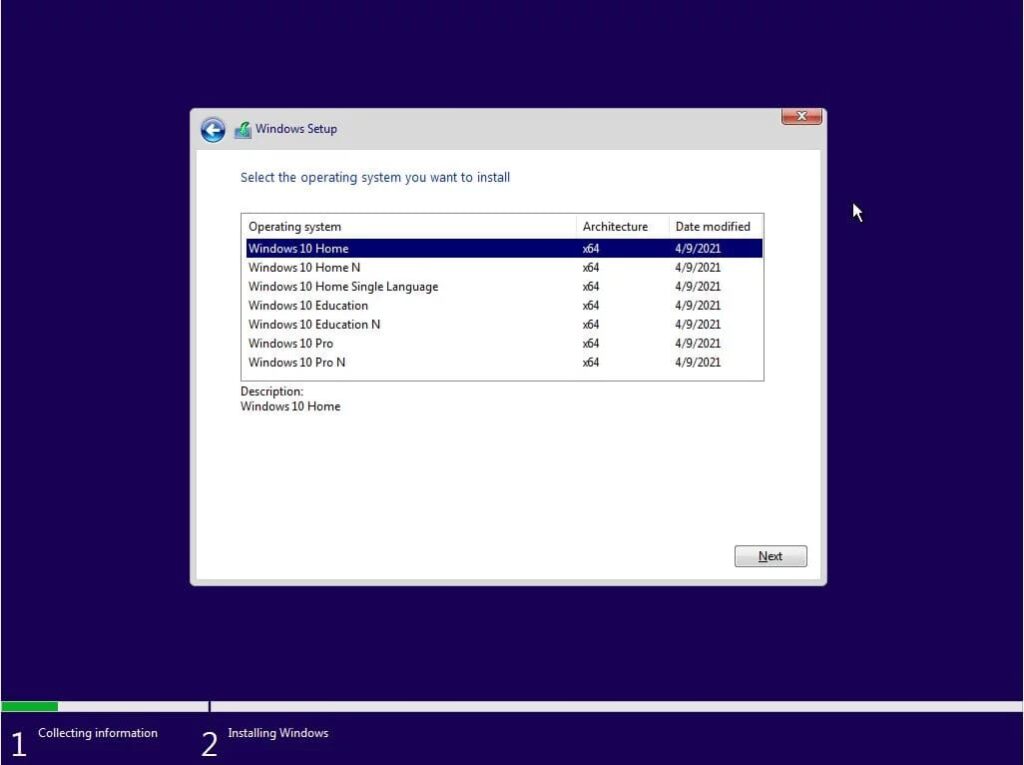 Next, choose the version of Windows 10 that you want. You can choose any version you like, or the one for which you have a purchased product key. In my example, I will install Windows 10 Home, but you can choose any other version. The installation process is the same for all versions.