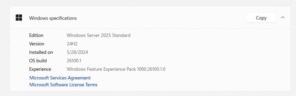 In the «About System» section, you can view your installed version of Windows Server 2025 and other specifications.