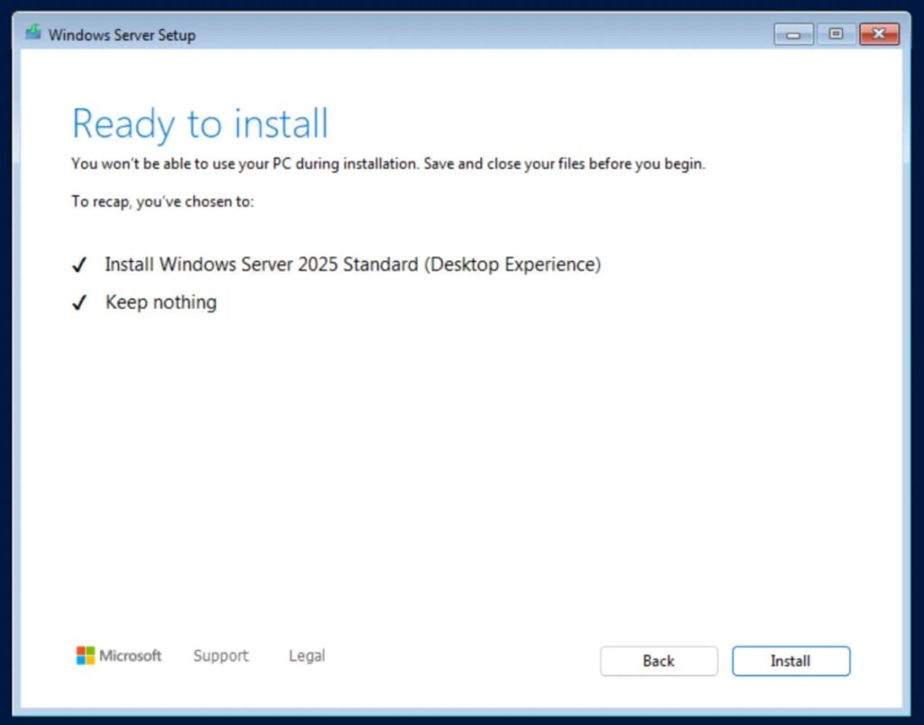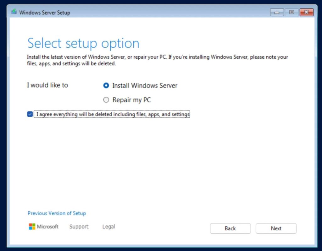 3) Next, select «Install Windows Server» and check the box next to «I agree everything will be deleted…».