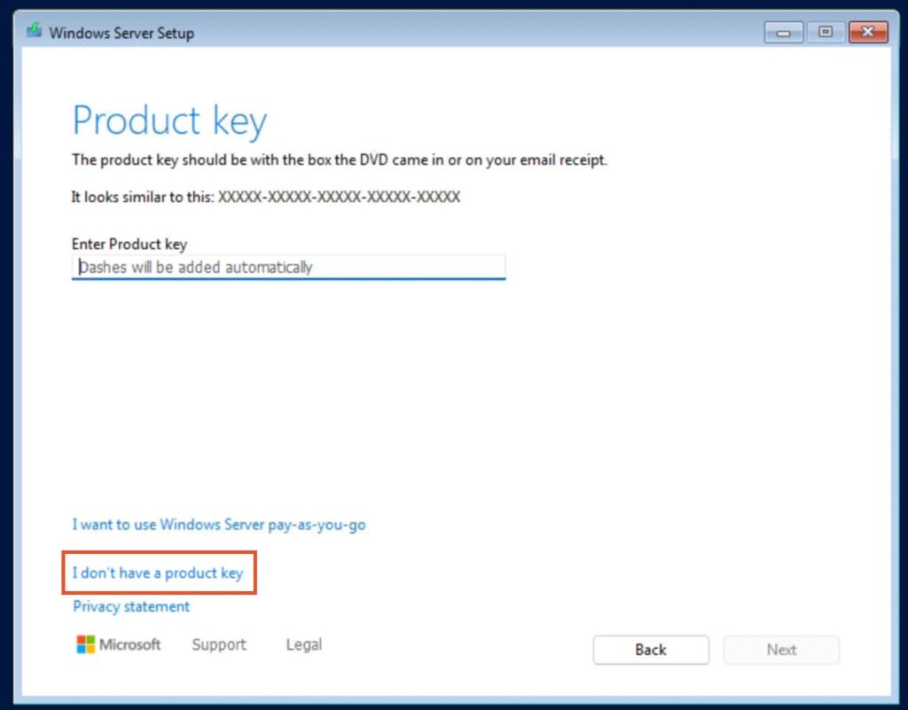4) We recommend entering the existing Windows Server 2025 product key after installation. Therefore, click «I don’t have a product key» and click «Next».