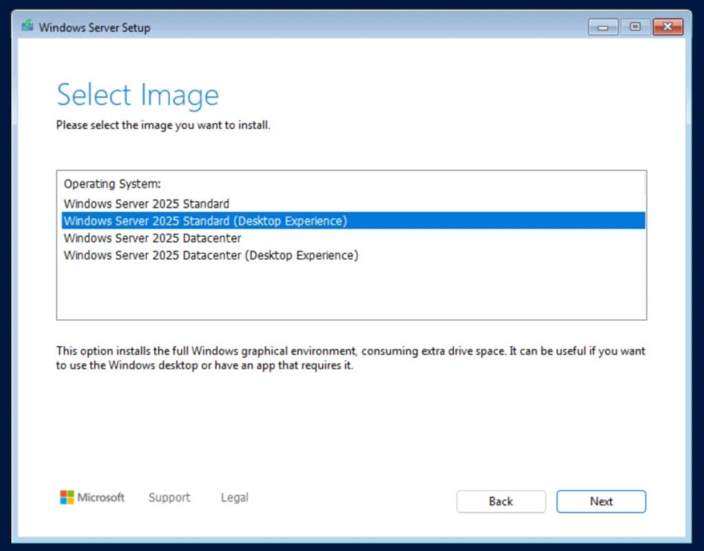 5) Choose the version of Windows Server 2025 you are going to install. In our example, this is Windows Server 2025 Standard with Desktop Experience, meaning with a graphical interface. Installation versions without this label will only be accessible through the command line (terminal).