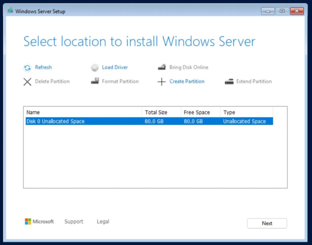 7) Select the hard drive where Windows Server 2025 will be installed.