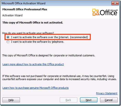 10) When you open it for the first time, the Microsoft Office activation wizard will appear. Select online activation and click «Next».