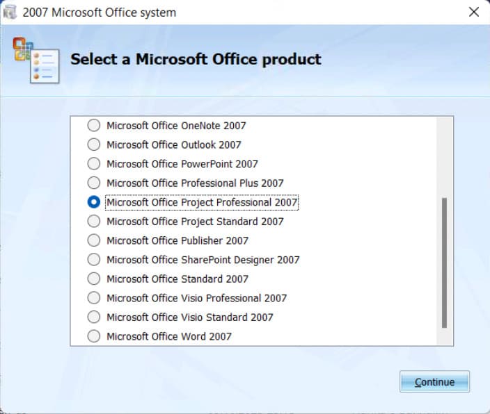 2. Select Microsoft Office Project Professional 2007.