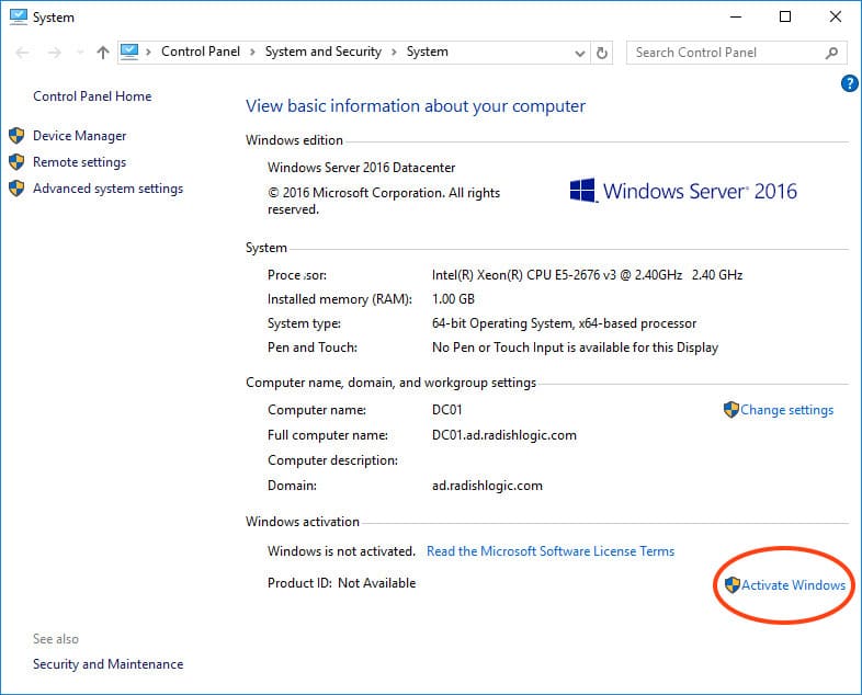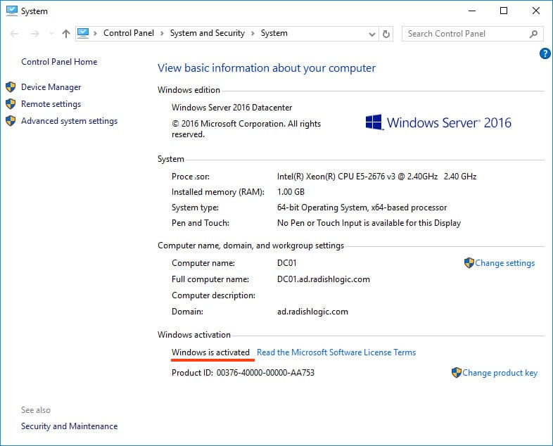 5) Let’s start with the initial setup without delving into the complexities of server system configuration. First, activate the system. Go to computer properties => Windows activation. There, you will need to enter the product key. You can purchase it from our online store at a low price. The key is delivered quickly to your email within an hour, so system setup won’t keep you waiting. You can purchase a product key for Windows Server 2016 in our catalog on this page.
