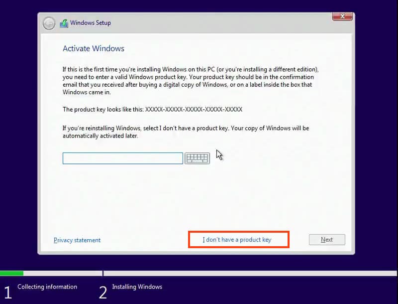 At the next stage, you will be asked for the product key for Windows Server 2016, which we will enter later, within the system itself. For now, select «I don’t have a product key.»