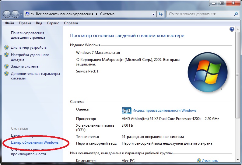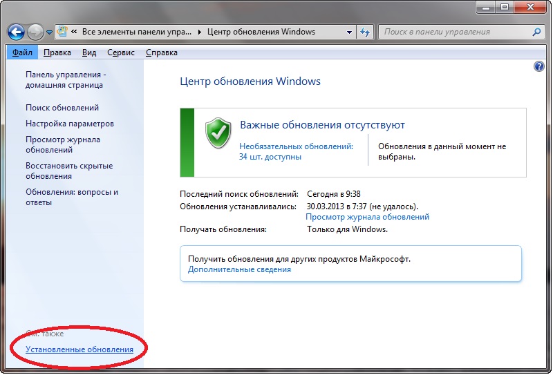 1) Правой кнопкой мыши нажимаем на значок Компьютер => Свойства. Выбираем «Центр обновления Windows» => Установленные обновления.