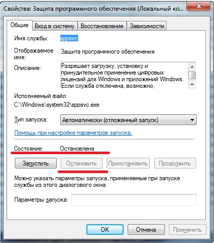 Пуск => Панель управления => Администрирование => Службы. Находим службу «Защита программного обеспечения». Если служба запущена нажать «Остановить».