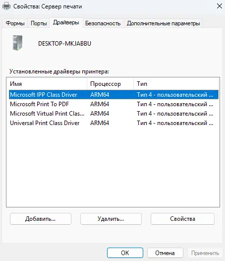 2. Откроется окно управления драйверами печати.