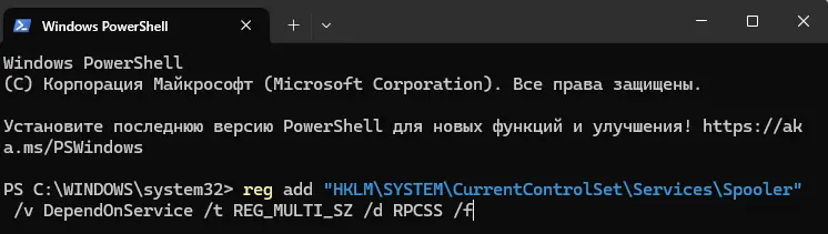 reg add "HKLM\SYSTEM\CurrentControlSet\Services\Spooler" /v DependOnService /t REG_MULTI_SZ /d RPCSS /f