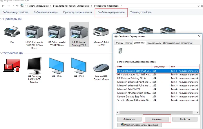 Иногда конфликты вызывают старые сетевые принтеры или драйверы, оставшиеся после переустановки. Чтобы удалить их полностью: