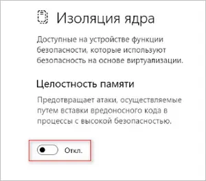 2. Переведите переключатель «Целостность памяти» в положение «Откл.».