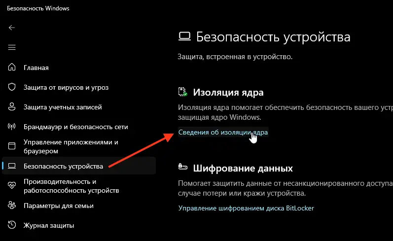 1. Перейдите в «Безопасность Windows» -> «Безопасность устройства» -> «Сведения об изоляции ядра».