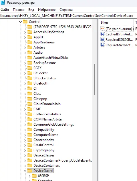 — Перейдите к пути: HKEY_LOCAL_MACHINE\SYSTEM\CurrentControlSet\Control\DeviceGuard