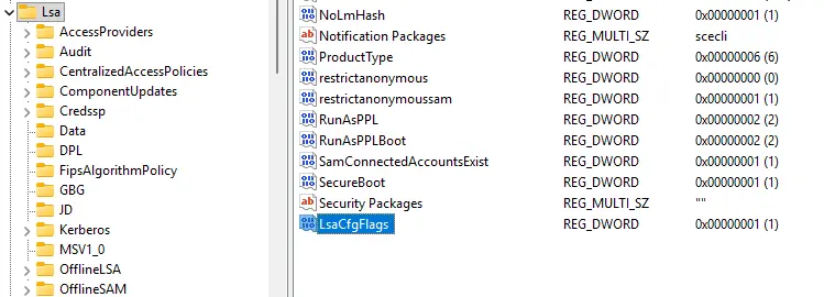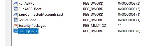 — HKEY_LOCAL_MACHINE\SYSTEM\CurrentControlSet\Control\Lsa -> LsaCfgFlags = 0.