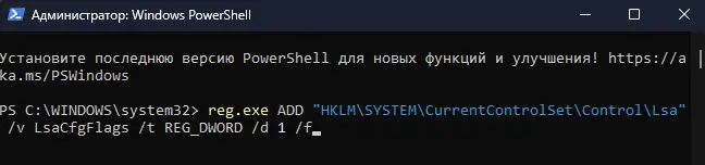 reg.exe ADD "HKLM\SYSTEM\CurrentControlSet\Control\Lsa" /v LsaCfgFlags /t REG_DWORD /d 1 /f