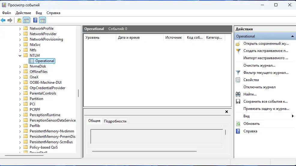 — Перейдите: Журналы приложений и служб -> Microsoft -> Windows -> NTLM -> Operational