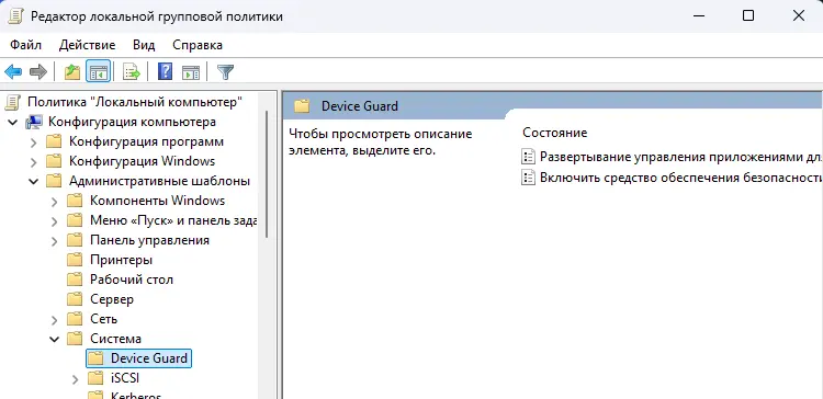 — Перейдите: Конфигурация компьютера -> Административные шаблоны -> Система -> Device Guard.